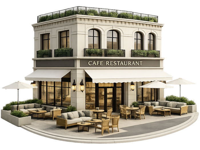 Nous assurons la conception et l’aménagement de cafés et restaurants à travers une démarche intégrée, de la modélisation 3D à la réalisation finale.
