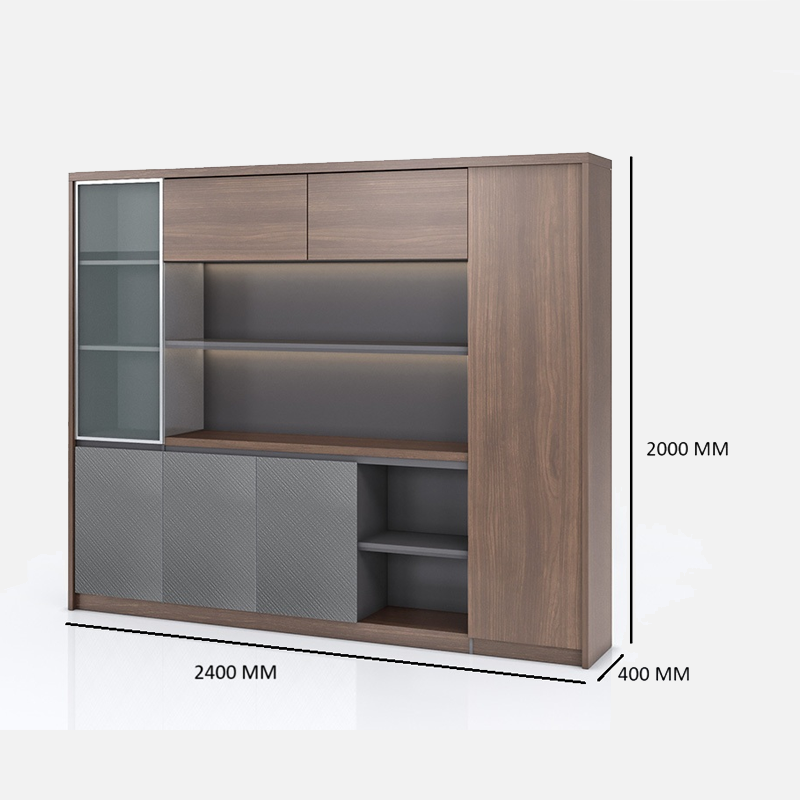 Elle mesure 2,4 mètres de largeur. Ainsi, elle offre un grand volume de rangement. Par conséquent, vous pouvez organiser facilement vos documents et vos objets professionnels. En outre, l’éclairage LED intégré met en valeur les étagères ouvertes. Cela illumine vos objets tout en conservant une ambiance sobre et raffinée.
