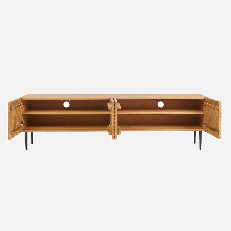 Ensuite, le piétement en métal noir garantit stabilité et élégance. Par ailleurs, les quatre portes dissimulent des espaces de rangement pratiques. Ainsi, vous pouvez