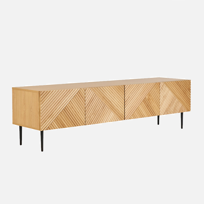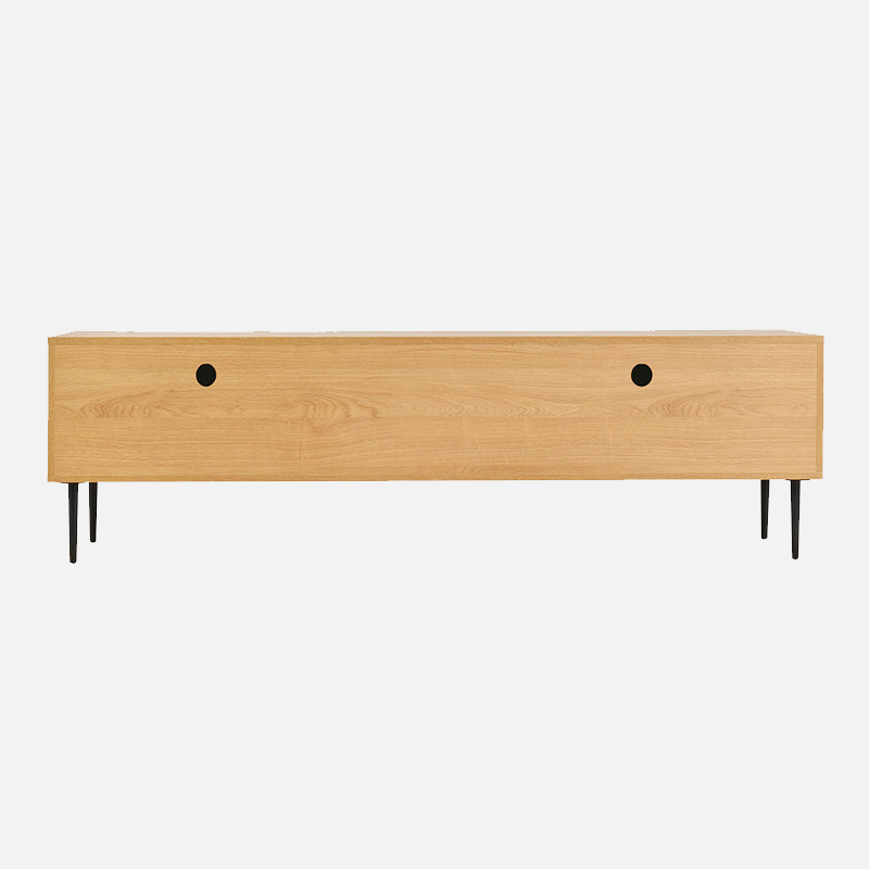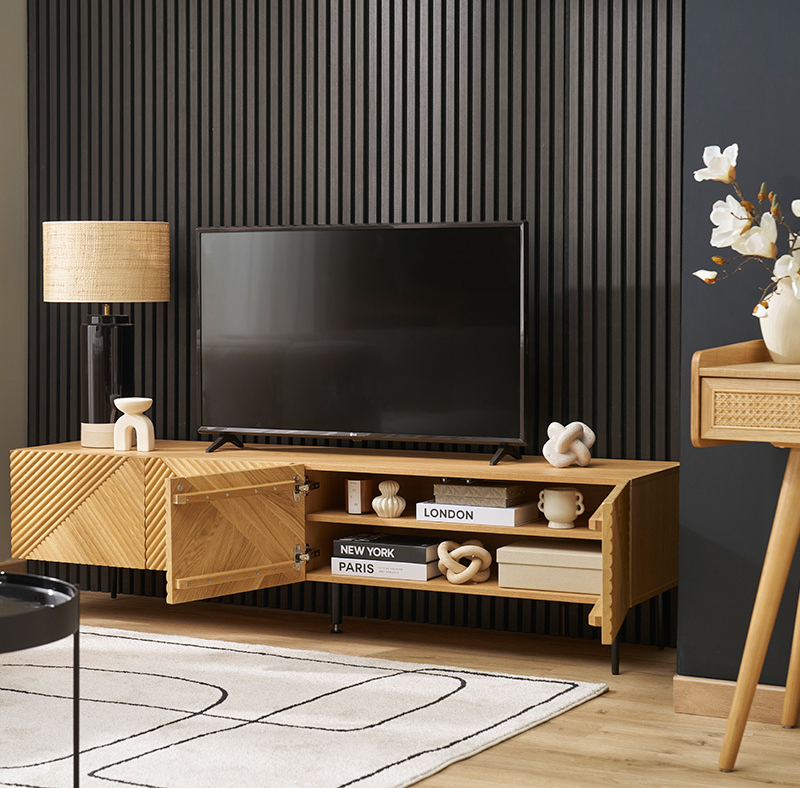 Le Meuble TV Lyshore combine à la fois design graphique et fonctionnalité. Tout d’abord, sa structure en panneaux de fibres de bois finition chêne clair apporte