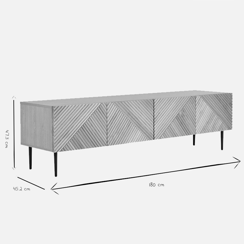 Les dimensions totales du meuble sont de L 180 × P 45,2 × H 47,3 cm et la hauteur des pieds est de 17,3 cm.