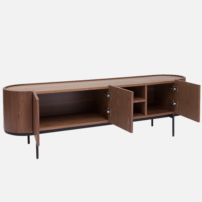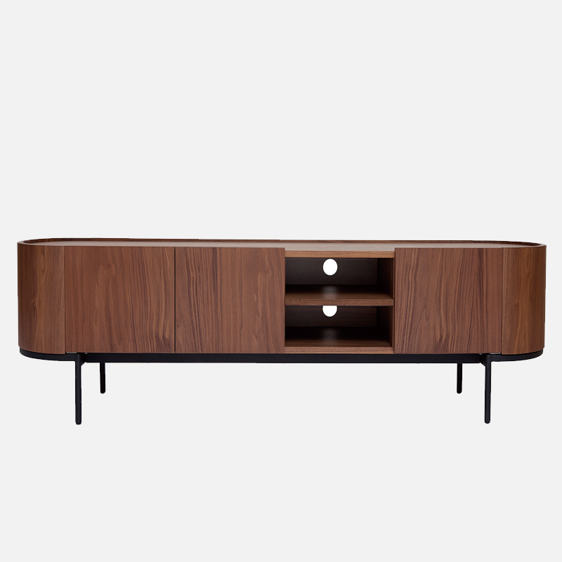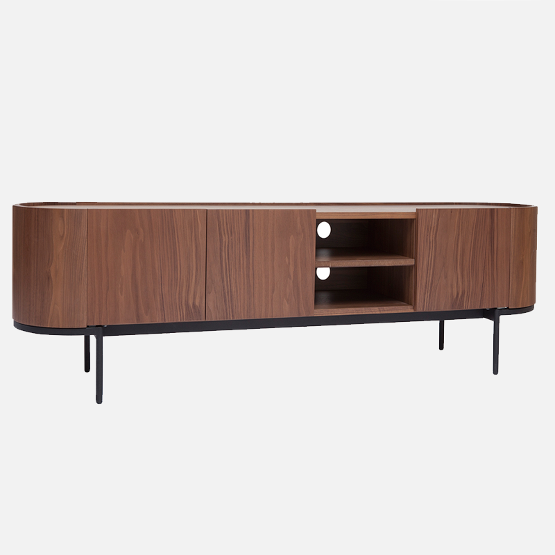 La structure en panneaux de fibres de bois habillée d’un placage noyer foncé offre une teinte profonde et chaleureuse. De plus, le piétement en métal noir apporte stabilité et caractère visuel.