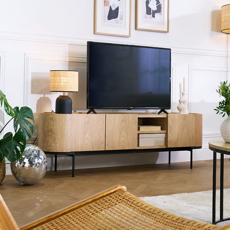 Le large plateau supérieur accueille un téléviseur et des éléments décoratifs. De surcroît, sa capacité de charge convient parfaitement aux équipements du salon. Enfin, le meuble est livré en