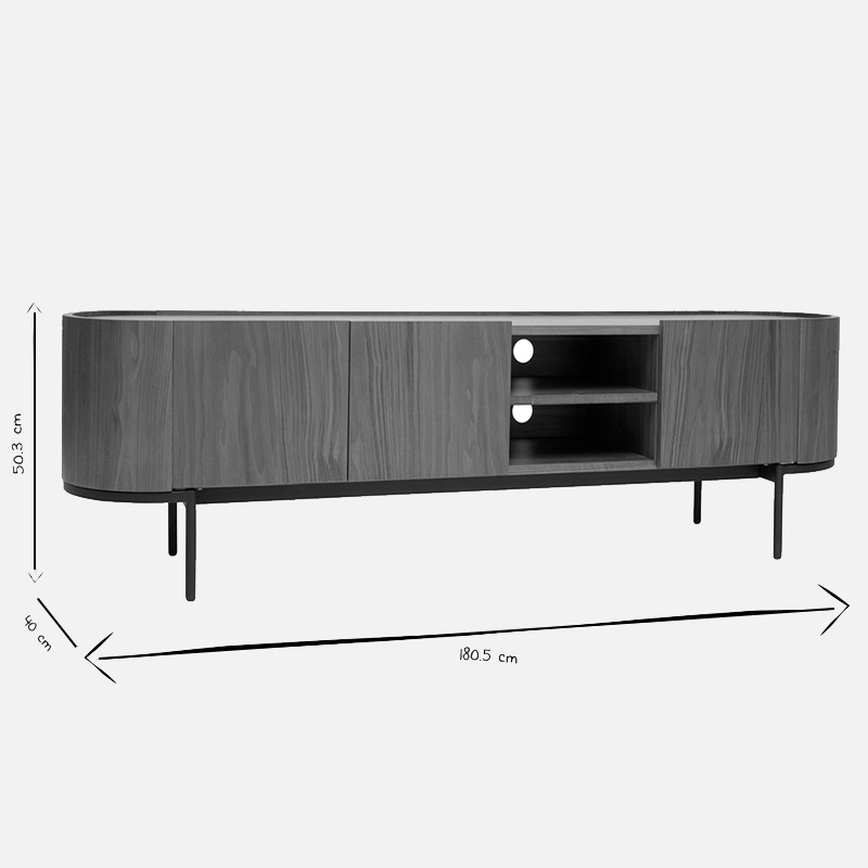 Dimensions totales L180,5 × P40 × H50,3 cm, hauteur des pieds 16 cm, niches ouvertes L34,8 × P37,2 × H11,8 cm, niches fermées L66,7 × P36,8 × H25,3 cm et L31,7 × P36,5 × H25,3 cm.