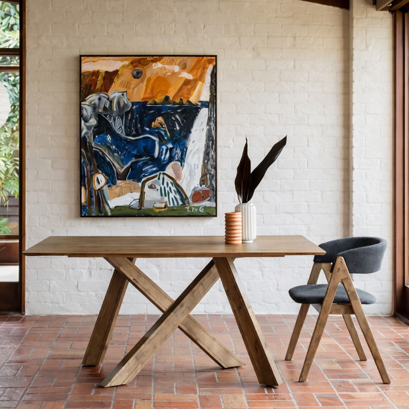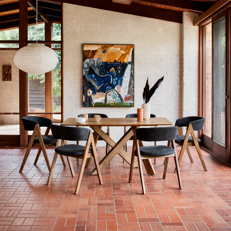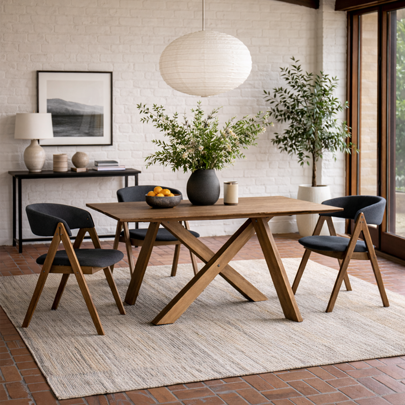 La table Cross 6 se distingue par sa structure en bois massif finition noyer, qui apporte immédiatement chaleur et élégance. Dans les visuels, elle devient la pièce centrale grâce à son contraste naturel avec le mur en brique blanche et le sol en terre cuite. Son piètement croisé en X, moderne et sculptural, renforce le style tout en assurant une excellente stabilité.