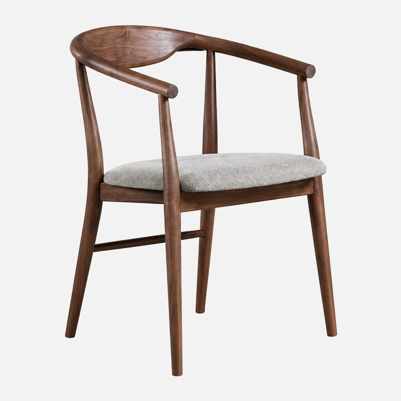 Les chaises assorties complètent l’ensemble avec leur dossier incurvé, accoudoirs intégrés et assise rembourrée en tissu doux, garantissant un excellent confort au quotidien.